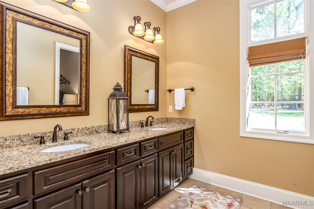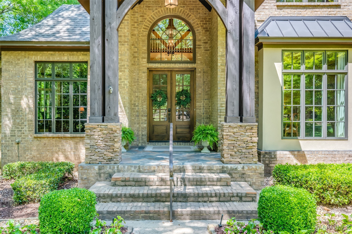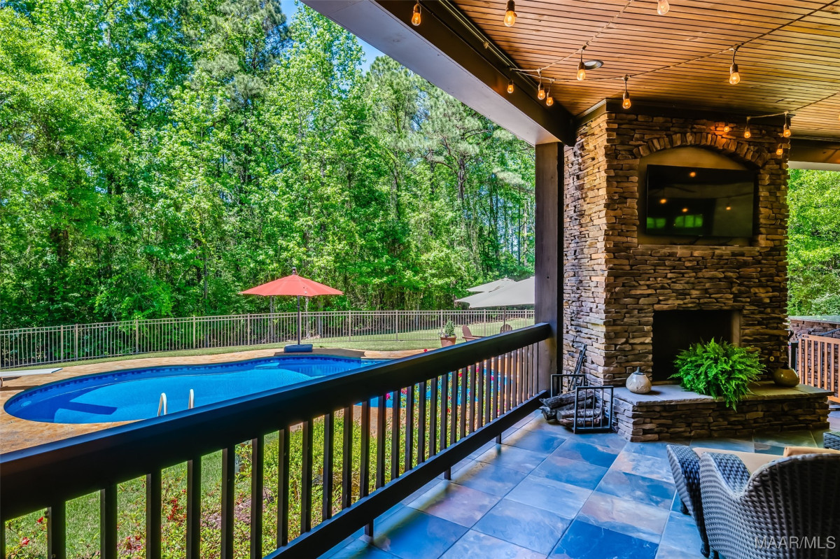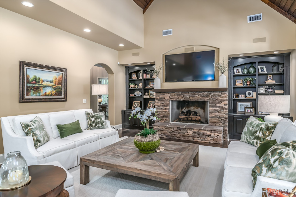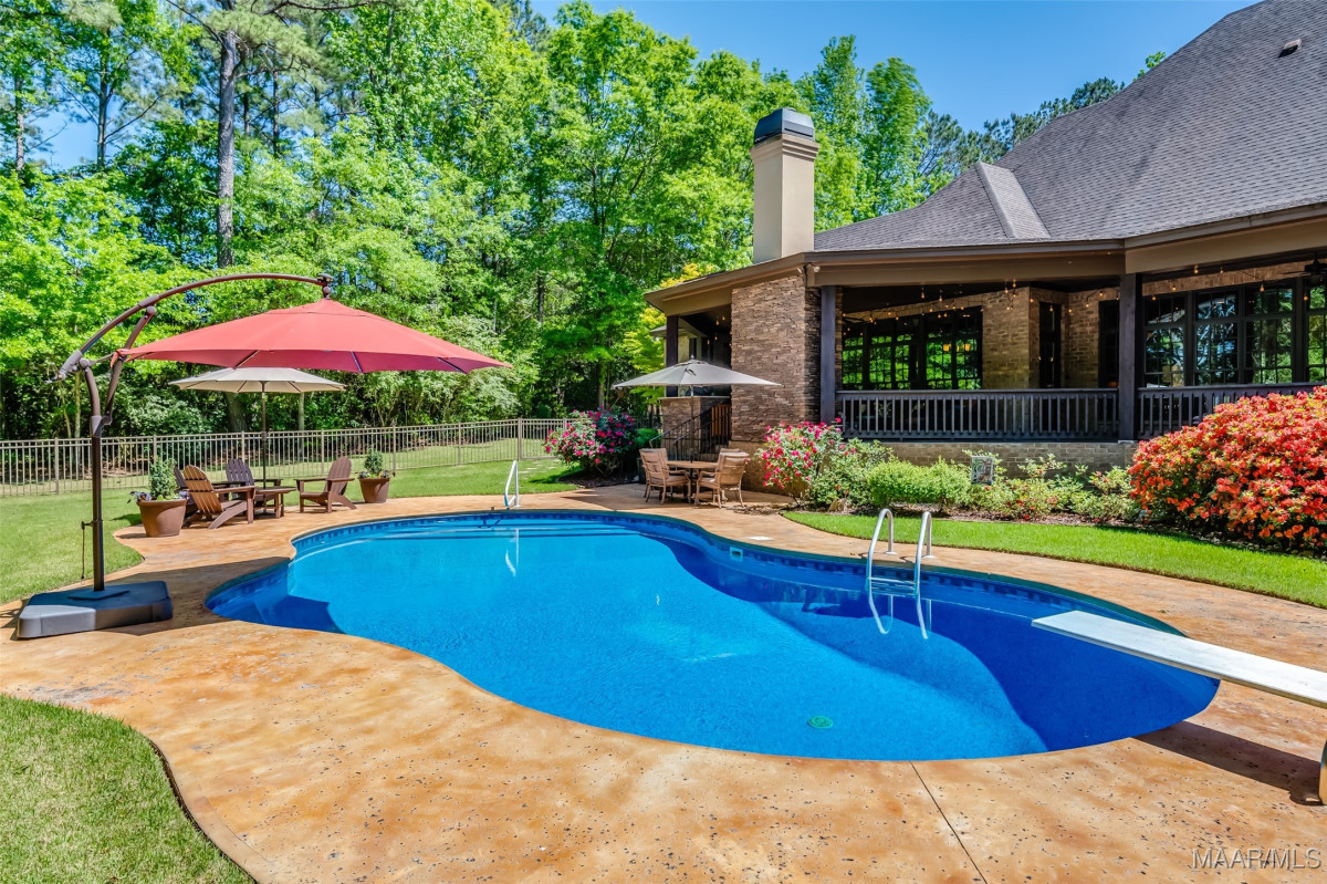 This home, CUSTOM BUILT by Nathan Watson & nestled on 2.55 acres, is LOADED with high-end finishes & custom touches that truly set it apart! Coming up the private driveway, you are greeted by professional landscaping & a PEACEFUL setting. The front porch has a vaulted tongue & groove ceiling, exposed wood beams & elegant double front doors, creating a grand & welcoming entrance. Step into the foyer, with a spacious Dining Room to one side-perfect for hosting gatherings or formal meals. On the opposite side is a large office, or optional library/sitting room, featuring custom built-ins. The Great Room boasts a tongue & groove ceiling, oversized stacked stone fireplace with expansive windows & a GORGEOUS view of the pool & back yard. The kitchen is a CHEF'S DREAM with KitchenAid Professional Series appliances, double ovens, six-burner gas stove, TWO large islands with additional storage, pellet ice machine, pull-out spice racks, & walk-in pantry. The Breakfast Room is OPEN to the Kitchen & also has AMAZING views. The primary suite is located on one side of the home & includes a sitting area with access to the covered back patio. The primary bath offers a true spa-like experience with a soaking tub, separate shower, double vanities & TWO closets with built ins. A secondary bedroom is also located downstairs, complete with an en suite bath & access to the back patio. Head upstairs where you'll find TWO guest bedrooms, EACH with a private bath. Delight in the MASSIVE bonus room with a connected sitting area. The outdoor living space is AMAZING with a HUGE covered porch with tile flooring, outdoor fireplace, built-in grill, sink, refrigerator, & granite countertops. Enjoy the kidney-shaped POOL with scored concrete pad & iron gate. Other features: surround sound, security system, underground sprinklers, drop zone, laundry room with sink, tankless water heaters. Also find crown molding, bull-nosed corners, foam insulation & 3 car garage. Easily zoned in to Pike Road School