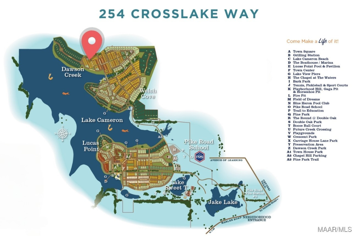 $10,000 CHOOSE HOW YOU USE INCENTIVE. ASK FOR DETAILS. Nestled in the serene community of The Waters in Pike Road, this new construction gem offers the perfect blend of beauty, functionality, & resort-style living with preservation area views from the front porch and just steps from Lake Cameron, the Blue Heron Pool Club, & green spaces. 438 sq ft of outdoor living space and thoughtful design touches throughout. 5 bedrooms, 4 baths, and an upstairs bonus room! Enjoy durable luxury vinyl plank (LVP) flooring throughout the entire home, with tile in the bathrooms. The open-concept kitchen, family room, & dining area are anchored by a cozy gas ventless fireplace with a brick surround. The kitchen offers designer finishes, walk-in pantry, under-cabinet lighting, extensive counter space, & TONS of storage. The downstairs owner’s suite features a volume ceiling, luxury bathroom with double vanity & linen cabinet, a walk-in shower with bench seating, soaking tub, & a very spacious walk-in closet. An additional downstairs bedroom & full bath make hosting family or guests simple & convenient. Upstairs, a cozy sitting area & large bonus/game room offer versatile space for play or relaxation, alongside three more bedrooms & two full baths, and spray foamed walk-in storage. Laundry area with built-in cabinets and drop station off the back porch. The back screened porch and party porch area are perfect for entertaining. The 2-car carport offers additional storage. World-class fishing, lake boating, multiple lakes, swimming pools, tennis & pickleball courts, a lakeside beach, dog park, fire pits, playgrounds, a sports court, bocce ball, a soccer field, & miles of green space & trails. Plus, Town Center shops and dining are just steps away, or a short drive takes you to Pike Road and Chantilly shopping districts. Located just 2.5 miles from I-85, Exit 16, and zoned for Pike Road Schools (K4–12th grade). Seller reserves the right to approve the buyer’s mortgage lender.